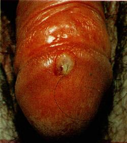Primary Stage The primary stage of syphilis is usually marked by the appearance of a single sore (called a chancre), but there may be multiple sores. The time between infection with syphilis and the start of the first symptom can range from 10 to 90 days (average 21 days). The chancre is usually firm, round, small, and painless. It appears at the spot where syphilis entered the body. The chancre lasts 3 to 6 weeks, and it heals without treatment. However, if adequate treatment is not administered, the infection progresses to the secondary stage.